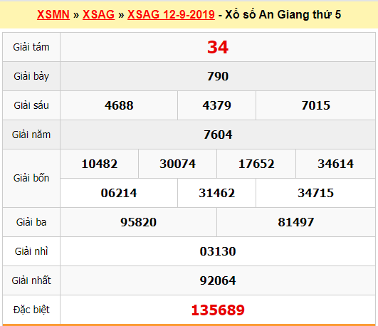 Về dự báo loto An Giang thứ 5 hôm nay ngày 19-9-2019 chúng tôi chắc chắn sẽ ra ít nhất là một con ở xổ số. Nhớ xem thêm quay thu xsmb để có thêm con số may mắn khi chơi xsmb.