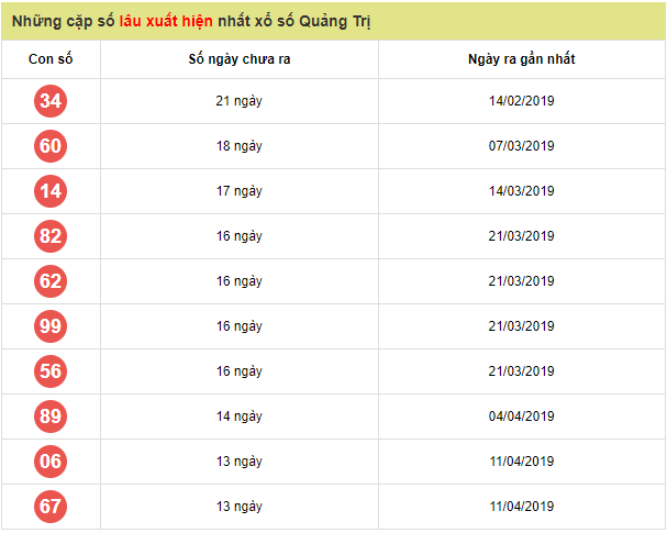 Thống kê xổ số Quảng Trị ngày 18/7/2019 chúng tôi sẽ chỉ ra cho các bạn những cặp loto gan lâu ngày chưa ra và những cặp loto về nhiều nhất trong những ngày gần đây. Từ đó sẽ giúp các bạn có thể nhìn thấy những cặp loto đẹp, loto kết để có thể chơi xổ số Quảng Trị hôm nay.